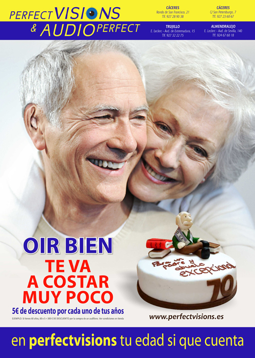 “En PerfectVisions la edad sí que cuenta” anuncia la franquicia en su nueva campaña dirigida a personas con problemas auditivos; y es que paralelo al envejecimiento es habitual padecer de una pérdida progresiva de la audición, diagnosticada como “hipoacusia” y aunque sin causa única conocida, con mucha frecuencia, es debida a cambios en el oído interno influenciados por los genes y ruidos fuertes a los que ha estado sometido.Con el propósito de cuidar la salud auditiva de sus clientes, la franquicia ha puesto en marcha una campaña bajo el título “Oír bien te va a costar muy poco”.