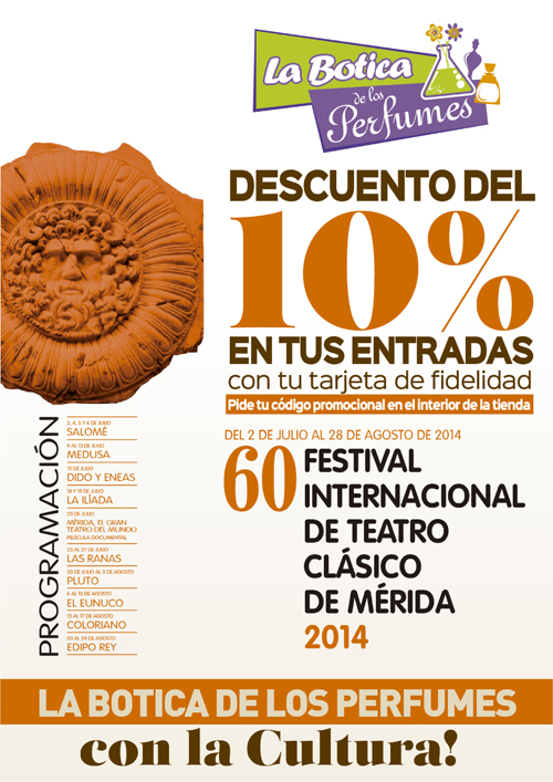 De esta forma, cada una de las 116 tiendas especializadas de La Botica de los Perfumes contará en sus mostradores con folletos promocionales de la 60 edición del Festival Internacional de Teatro Clásico de Mérida, para atraer a nuevos visitantes a la ciudad, teniendo en cuenta que La Botica está presente en las principales ciudades de la mayoría de Comunidades Autónomas, suponiendo un buen reclamo.