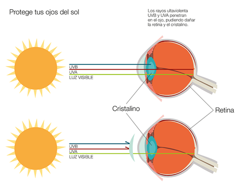 Al igual que protegemos la piel y una deficiente protección de la misma puede ocasionarnos daños a corto plazo (quemaduras), a medio plazo (manchas en la piel) y a largo plazo (aumenta la posibilidad de cáncer de piel), en nuestro sistema visual podemos tener también daños a corto plazo por sobreexposición extrema a la radiación solar (queratitis, conjuntivitis, etc.), a medio plazo (opacificación del cristalino y apariciónprematura de cataratas, pinguecula, pterigium, etc.) y a largo plazo (quemaduras en retina, DMAE, etc.). Todas ellas son lesiones que se pueden evitar con el adecuado uso de una gafa de sol con una protección ultravioleta.